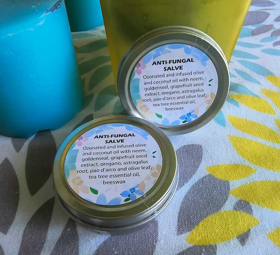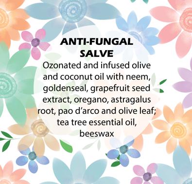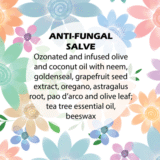 This is a VERY potent (but safe!) anti-fungal salve. I infused many amazing anti-fungal (and anti-candida) herbs into coconut and olive oils (both organic and extra virgin). Then, I ozonated the infused oil so that it’s potency is unmatched. It is ozonated for over 100 hours.
